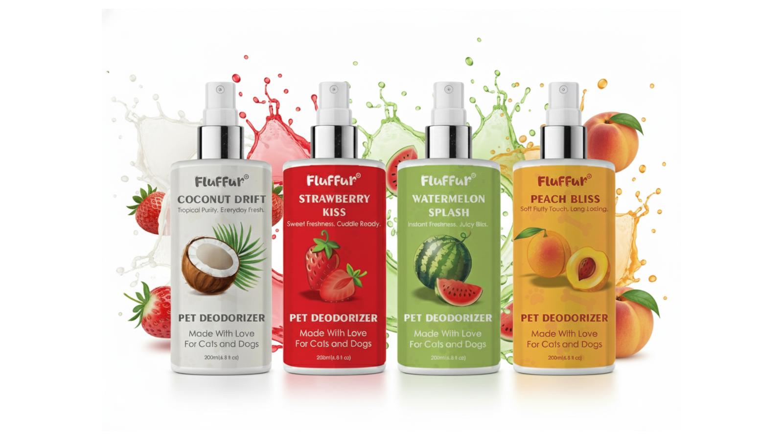 Fluffur Pet Deodorizer – Peach Bliss / Coconut Drift / Watermelon Splash / Strawberry Kiss | Long-Lasting Fruity Freshness | Pet-Safe Odor Neutralizer for Cats & Dogs | 200ml
